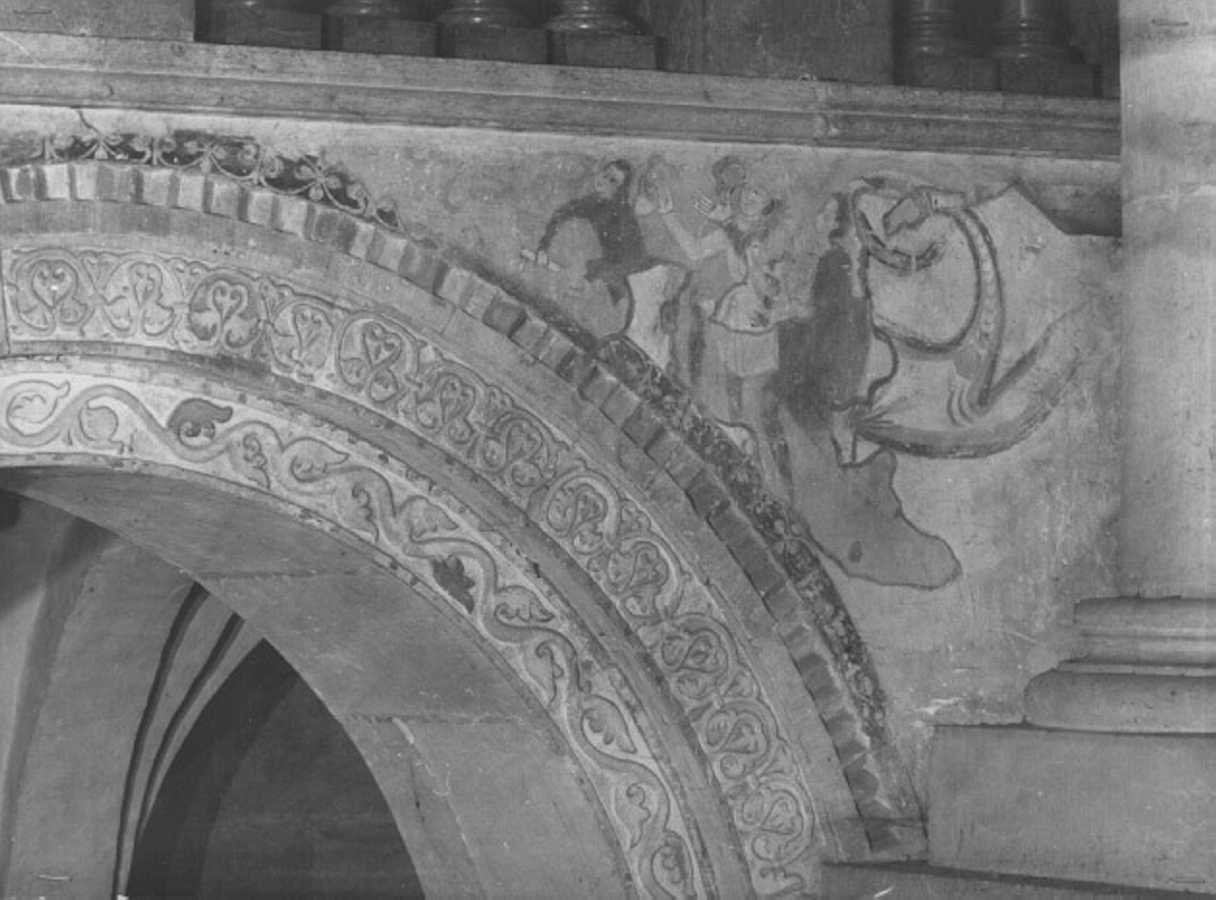 - NOTIZIE STORICO CRITICHE Gli affreschi sulla parte centrale del pontile, sopra gli archi di accesso alla cripta sono di complessa identificazione per quanto ri- guarda il soggetto, che appare comunque di carattere allegorico. Anteriori certamente all 1300, vanno datati per l'Arslan (1943, p. 170) al Duecento, mentre la Sandberg Vavala' (1926, p. 397) non esclude che possano datarsi anche al XII secolo. Nel secondo affre- sco e' stata ipotizzata dal Da Lisca (1941, p. 267) la presenza di un duplice strato, proposta ripresa da Arslan (1943, ibidem), ma va notato che comunque gli uccelli appartengono al medesimo momento pittorico della figura centrale, interpretate come un imperatore, e che si trovano sopra una cornice dipinta in precedenza. Il dipinto raffigura presumibilmente un groppo di storpi