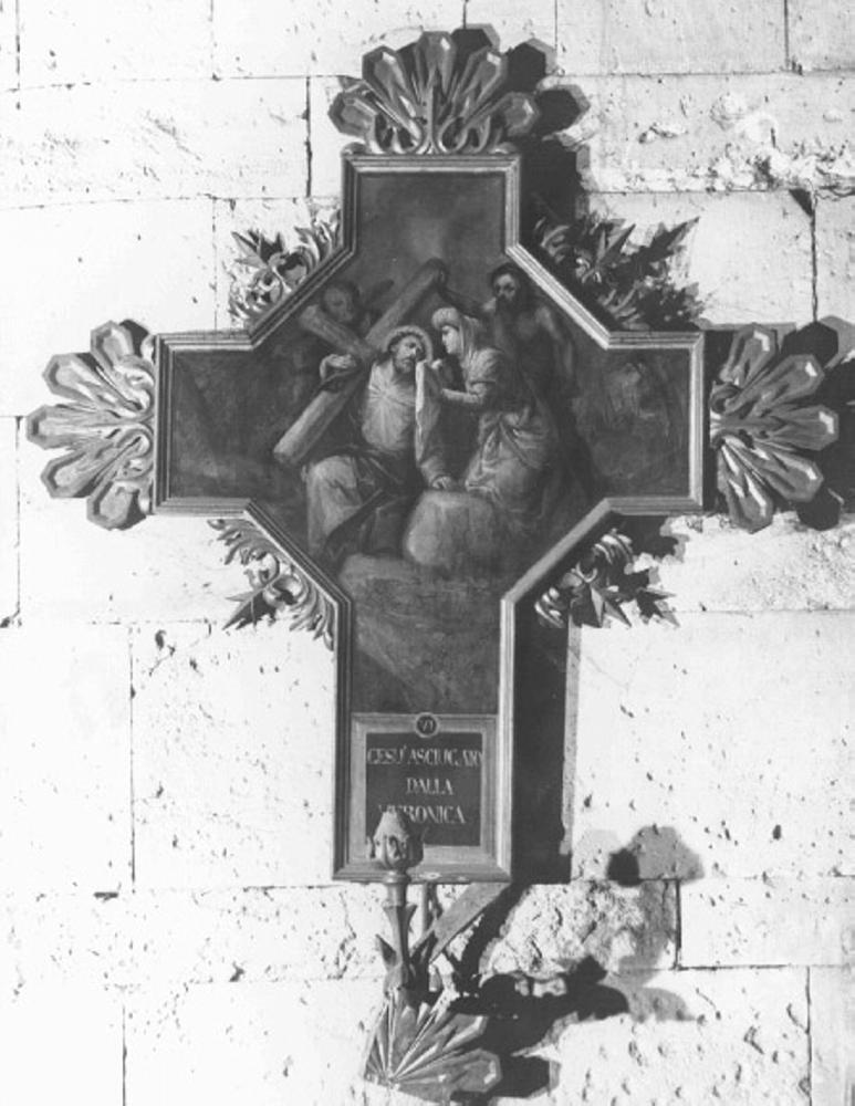 Personaggi: Gesù Cristo; Veronica. Figure maschili: soldati; uomini. Armi: lance Oggetti: panno. Simboli della passione: croce