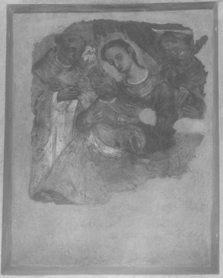 - NOTIZIE STORICO CRITICHE Lavoro di mediocre levatura, opera di un frescante di formazione veneta attardata. Lo schema compositivo e' legato alle sacre conversazioni del sec. XVI, di cui e' esempio l'affresco di Giovanni Battista del Moro, proveniente da casa Fortis (Vr) e ora al Museo Civico, databile intorno al 1550 / 70