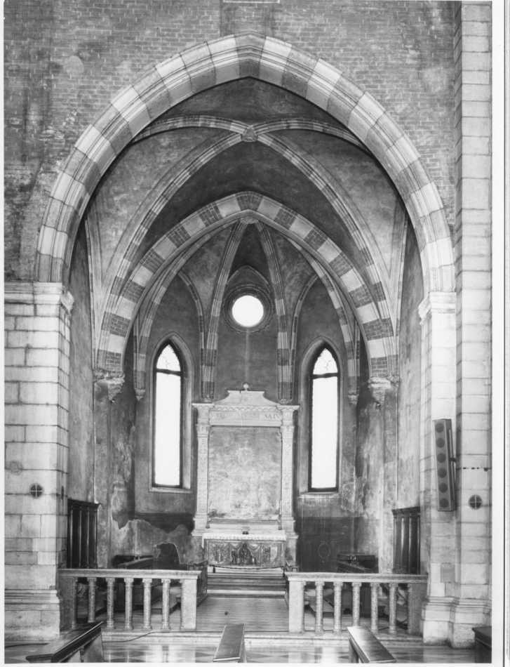 Un arco a sesto acuto decorato a conci alternati dà accesso alla cap pella con volta a crociera e abside pentagonale costolonati. Ai lati dell'altare: due bifore; in alto: oculo. Alle pareti sono addossati stalli lignei. Stemma gentilizio sopra l'arco