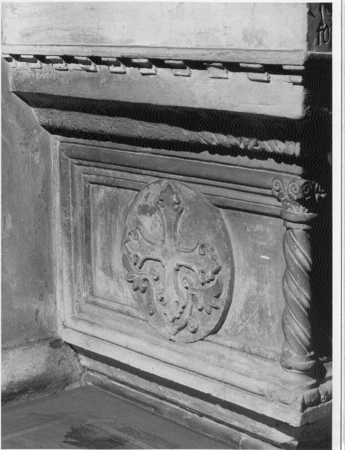 Croce greca con bracci a terminazioni gigliate inclusa entro tondo. Decorazione: motivi vegetali