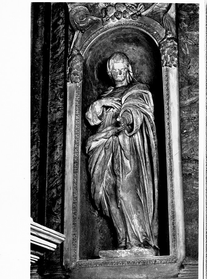 - NOTIZIE STORICO CRITICHE Parte importante della decorazione plastica della cappella, le quatt ro statue sono ricordate per la prima volta dal Barbarano (1761). Ri ferite genericamente alla scuola degli Albanese (Buffetti, 1779), le sculture sono attribuite a Girolamo Albanese dal Formenton (1967), basandosi su affinità stilistiche con le statuine del tabernacolo de l SS. Sacramento; con questa ipotesi concorda anche l' Arslan (1956) . Datate tradizionalmente al quinto decennio del XVII secolo, le st atue sono collocate tra 1637 e 1643 dal Barbieri (1970), che vi vede tratti manifestamente barocchi. Di diverso avviso il Saccardo (1981 ), che documenta la loro esecuzione con una delibera del 1641, e, pi ù recentemente, il Ballarin (1986), che avanza l'ipotesi di una dive rsa sequenza cronologica per i lavori nella cappella, anticipandoli al 1628-29. Il Ballarin non pone una datazione precisa per le statue delle pareti, ma richiamando l'attenzione sulla loro notevole quali tà, sembra prospettare la retrodatazione dell'intero gruppo: retroda tazione peraltro possibile alla luce di altri documenti pubblicati d al Saccardo(1981). Per una collocazione cronologica più precisa andr ebbe tuttavia riletto totalmente l'intero percorso artistico dello s cultore vicentino