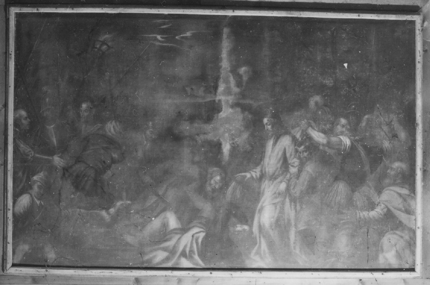 - NOTIZIE STORICO CRITICHE Il dipinto fa parte del ciclo con scene della passione di Cristo, collocato nella navata sinistra della chiesa dopo le ristrutturazioni ottocentesche. Con altre tre tele del ciclo - raffiguranti Cristo deriso, presentazione e incoronazione di spine di Cristo - è opera di artista veneto di fine Cinquecento attento alla scuola padovana di metà secolo, con qualche suggestione alla Nicolò Frangipane