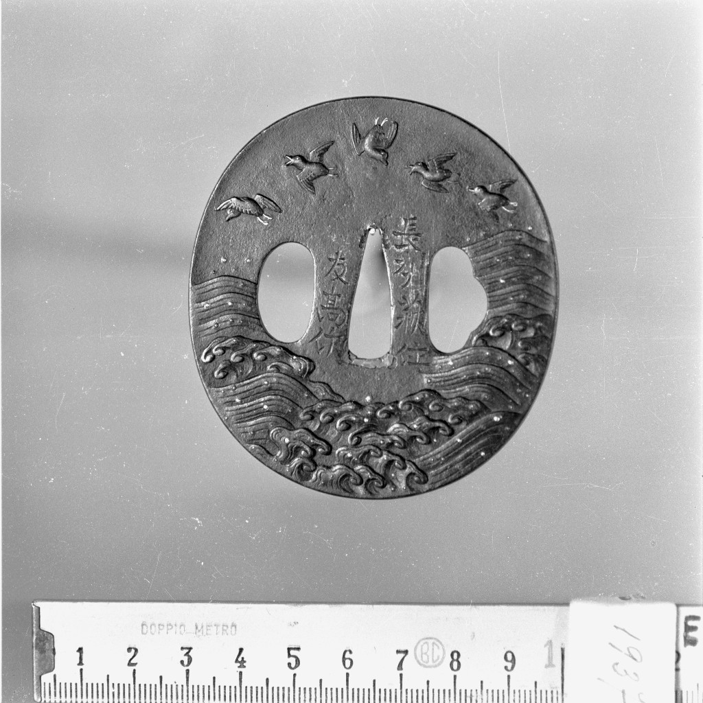 TSUBA CON RYOHITSU. LAVORAZIONE IN ISHIME-JI, TAKA-BORI, TAKA-ZOGAN IN ORO. RAPPRESENTA SIA SUL RECTO CHE VERSO UN VOLO DI PIVIERI SOPRA LE ONDE