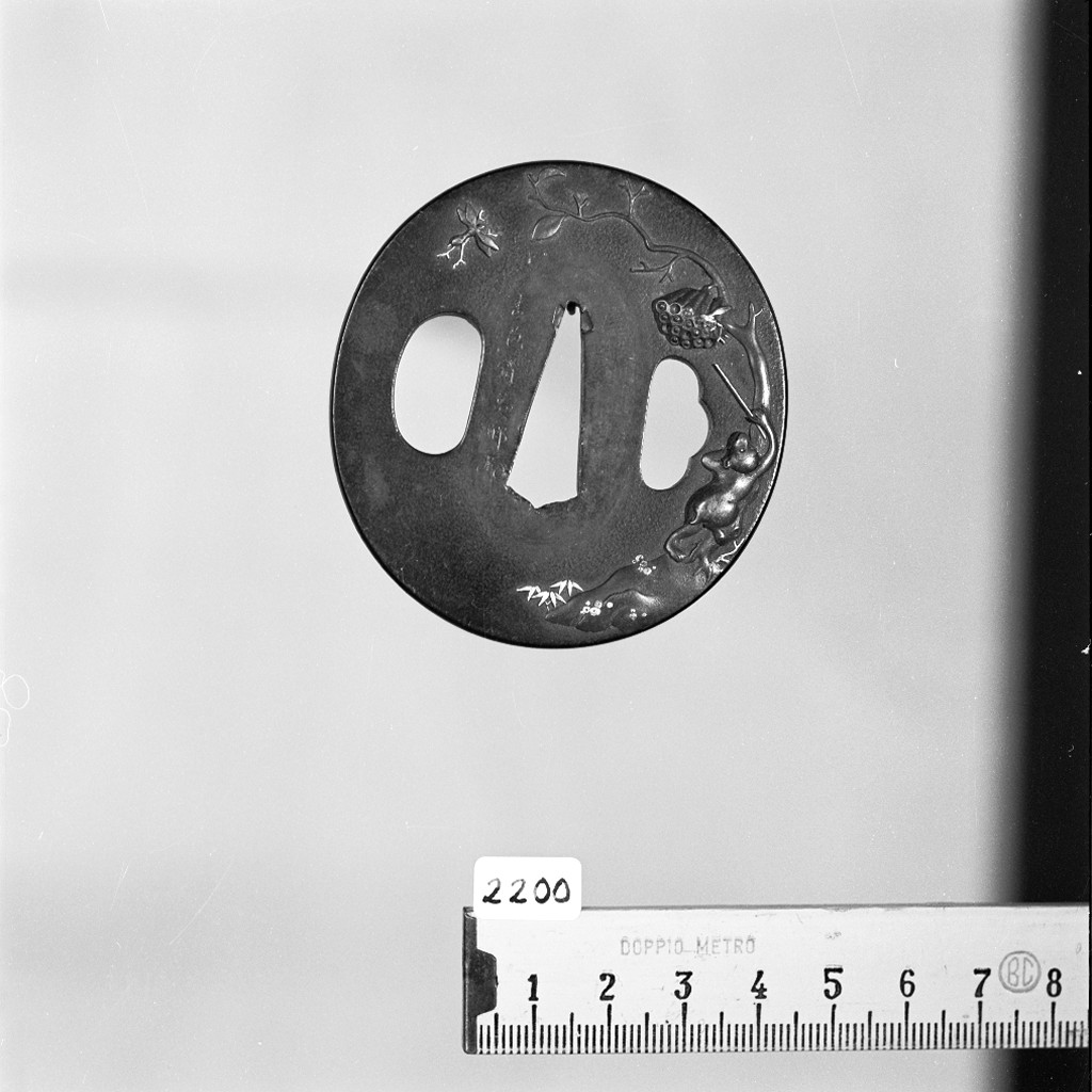TSUBA IN SHAKUDO. SFONDO IN ISHIME JI. LAVORAZIONE IN TAKA-NIKU-BORI, ISOR-TAKA-ZOGAN; SUKI-DASHI-BORI PER IL FIUME. RAPPRESENTA SUL RECTO UNA SCIMMIA CON UNA CANNA CHE MOLESTA UN ALVEARE. SUL VERSO UNA SCIMMIA PRESSO UN CORSO D'ACQUA