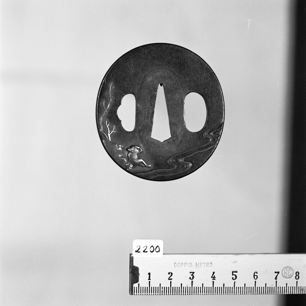 TSUBA IN SHAKUDO. SFONDO IN ISHIME JI. LAVORAZIONE IN TAKA-NIKU-BORI, ISOR-TAKA-ZOGAN; SUKI-DASHI-BORI PER IL FIUME. RAPPRESENTA SUL RECTO UNA SCIMMIA CON UNA CANNA CHE MOLESTA UN ALVEARE. SUL VERSO UNA SCIMMIA PRESSO UN CORSO D'ACQUA