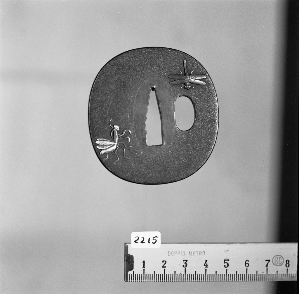 TSUBA IN SHAKUDO DI FORMA NADE-MARU. KATA-HITSU. LAVORAZIONE IN TAKA-NIKU-BORI IROE-TAKA-ZOGAN. RAPPRESENTA SUL RECTO UN'APE, UNA FALENA E UNA CHIOCCIOLA. SUL VERSO LIBELLULA E CAVALLETTA