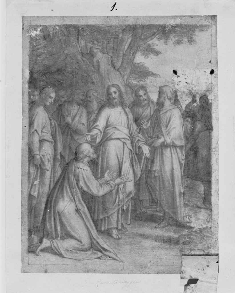 - NOTIZIE STORICO CRITICHE Il disegno, concordemente dato al Salmeggia negli Inventari e nella bibliografia, sulla base della scritta attributiva del Bossi (un disegno dell'artista è citato nel Volume al lotto 7 del Sommario della vendita della col lezione Bossi, del 1818),è lo studio preparatorio per un "modello" ad olio dell'Accademia Carrara di Bergamo (cfr. App., fig. 10), al quale si riferisce testualmente. Entrambe le opere possono essere inoltre messe in relazione con una tela di eguale soggetto nella chiesa parrocchiale di Scanzorosciate (Bergamo), databile entro il secondo decennio del Seicento, che presenta peraltro numerose varianti (per il dipinto cfr. Ruggeri 1978, p. 320, n. 122, e p. 135, fig. 6). La variante studiata nel n. 499, tramite il frammento di destra incollato e parzialmente spostabile, coincide più strettamente con il "modello" della Carrara di quella del n. 499 A. Un altro studio del Salmeggia preparatorio per una Consegna delle chiavi si conserva alla Biblioteca Ambrosiana di Milano (Cod. F. 254 inf., n. 1515), ed è del Salmeggia anche un dipinto con Disputa di S. Caterina già nella collezione di Sir Martin Conway, pubblicato dal Berenson (1907, p. 186) come Giulio Campi, passato a Londra, Christie's, 31 gennaio 1951, n. 37, come Sebastiano del Piombo e ivi, 10 dicembre 1954, n. 122, ancora come Giulio Campi