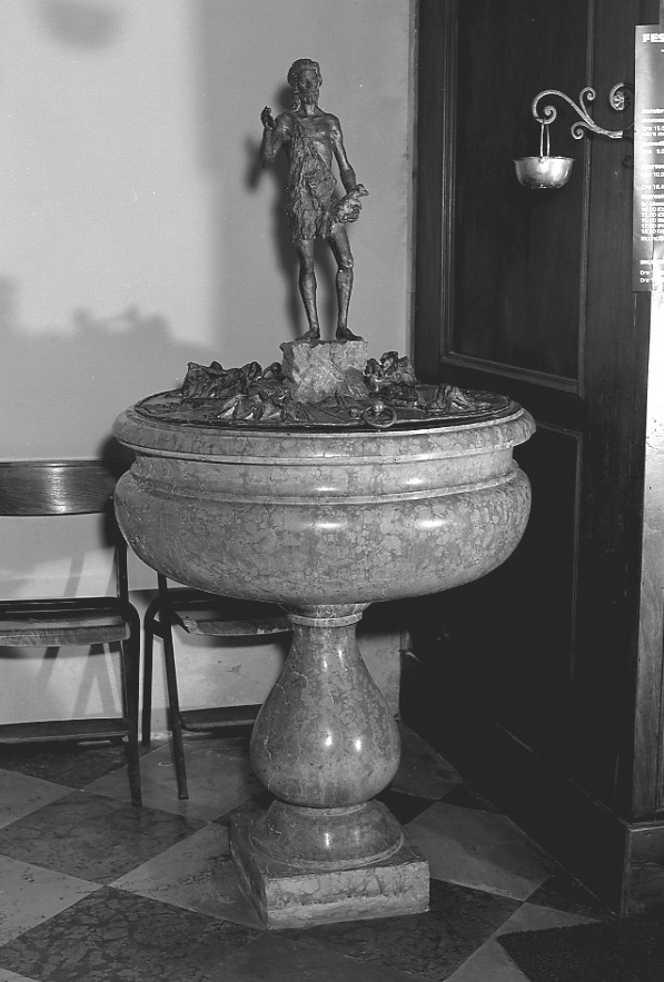 - NOTIZIE STORICO CRITICHE Il coperchio e la statua raffigurante S. Giovanni Battista, in bronzo, sono opere moderne di Pier Luigi Sopelsa. Un tempo il coperchio era in legno lavorato e tinto a mano con statua del Battista (Arch. Parr., 1868). La vasca risale al sec. XVIII,mentreilcoperchio è del sec. XX