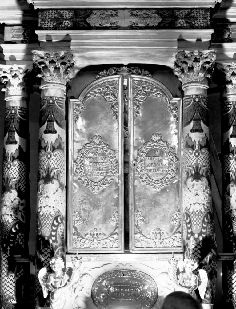 Portelle copri-icona azionate da un meccanismo a manovella posto sul retro dell'altare maggiore. In argento sbalzato le portelle formano un rettangolo centinato nella parte superiore. Al centro, entro un medaglione circondato da foglie di alloro intrecciate, le iscrizioni dedicatorie. Motivi floreali, uguali per le due sportelli, nella parte inferiore e superiore