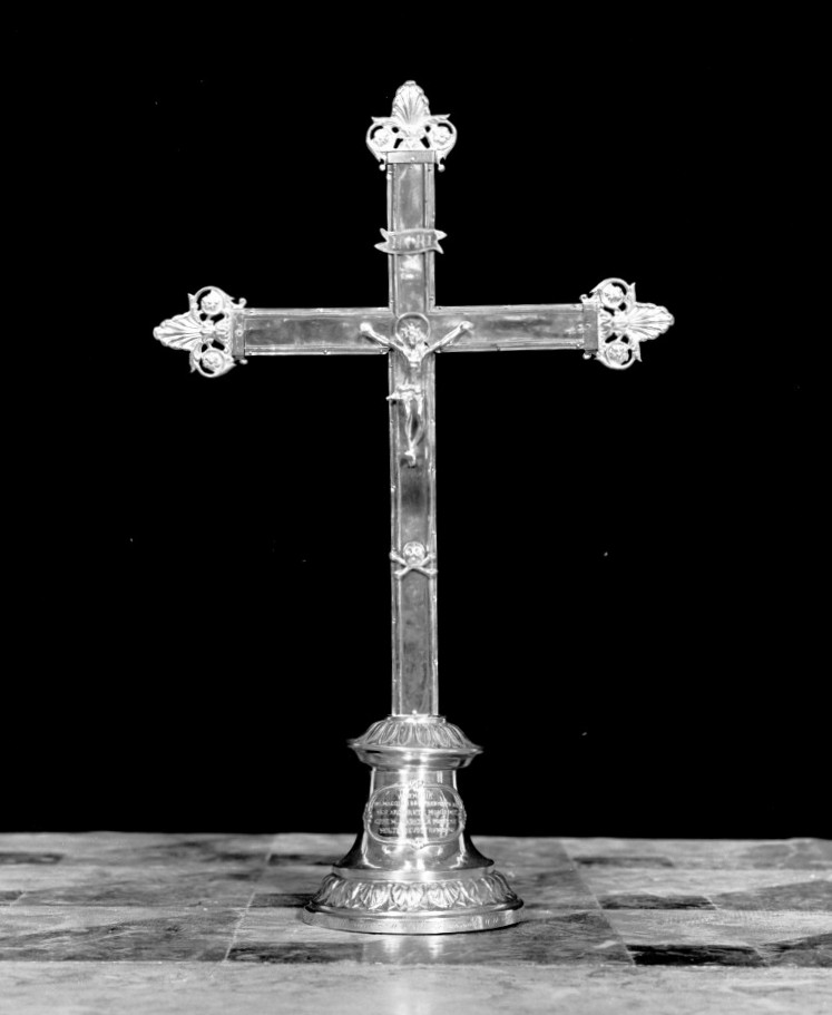 Crocefisso in legno e foglie d'argento. Su di una base circolare, ornata da un motivo floreale, cartiglio con scritta dedicatoria. La croce si innesta su di un anello decorato da foglie allungate. Nel terzo inferiore, il simbolo della morte. Nel braccio superiore cartiglio con la scritta: INRI. Lobi terminali decorati con due volute, con al centro altrettanti fiori, e foglie nel mezzo. Piccolo Cristo con perizoma con nodo sulla sinistra