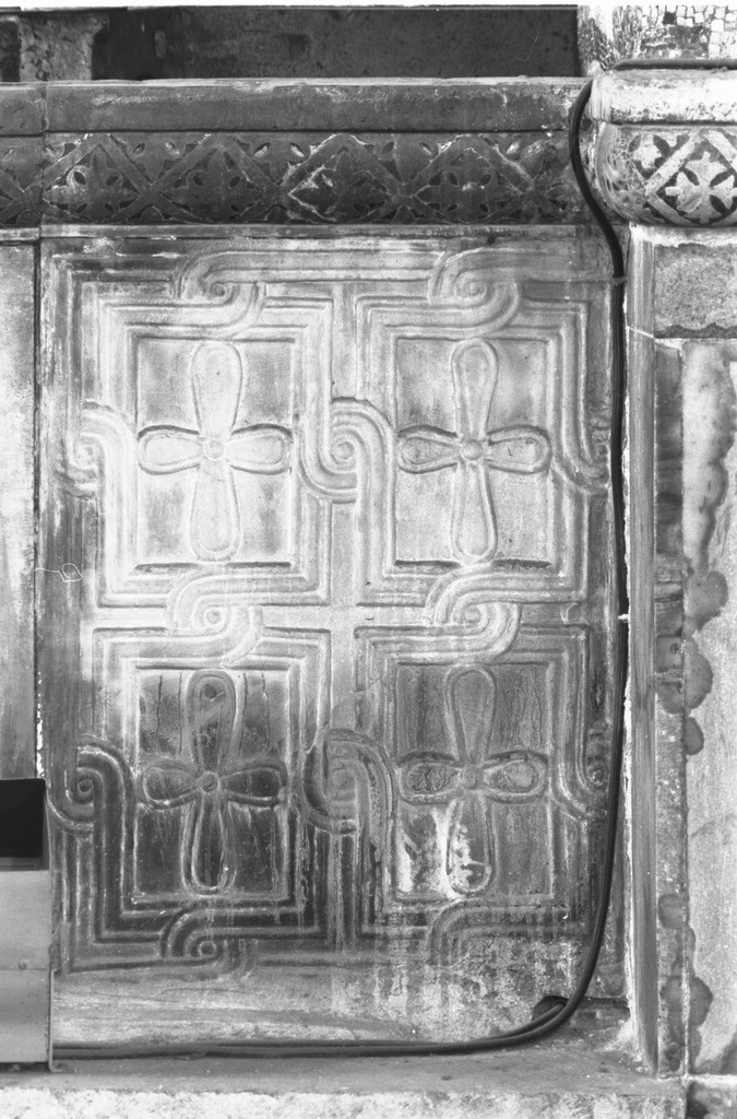 - NOTIZIE STORICO CRITICHE LA LASTRA É ASSAI INTERESSANTE. SI TRATTA DEL FRAMMENTO SUPERIORE SINISTRO DI UNA GRANDE LASTRA, DI CUI RESTA ANCORA IL LATO DESTRO (0500070958), CHE COMBACIA PERFETTAMENTE CON QUESTO. L'OPININE DELLO ZULIAN CHE VUOLE QUESTE LASTRE DEL SECOLO XI°-XII° "IN STILE" ED SEGUITA "APPOSTA PER LA LORO COLLOCAZIONE ATTUALE", VA DUNQUE ASSOLUTAMENTE RIFIUTATATA. SI VEDANO ANCHE LE SCHEDE N. 0500070948-0500070950