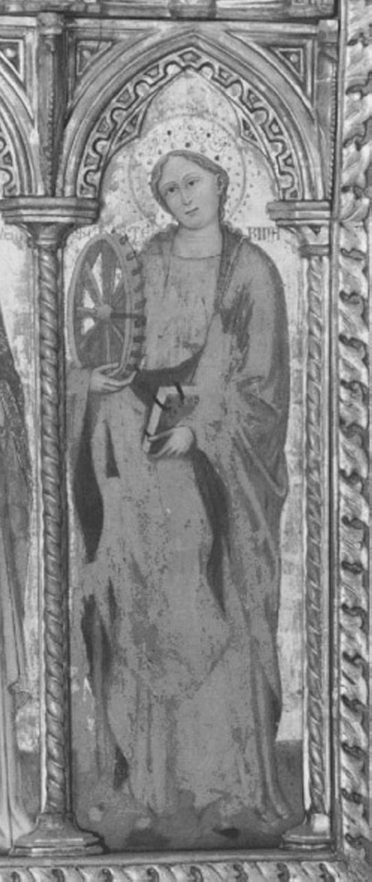 - ISCRIZIONI Ai lati del collo della santa - S. CHATERINA - caratteri gotici - a pennello - latino