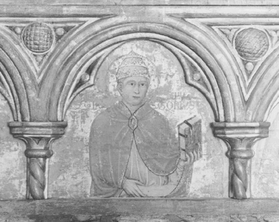 - ISCRIZIONI Ai lati del collo del Santo - S. GREGORIUS P.P - caratteri gotici - a pennello - latino