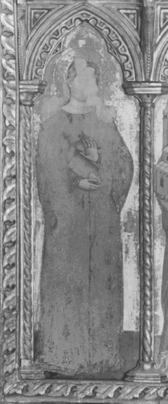 - ISCRIZIONI Ai lati del collo della Santa - (S. A)GNES - caratteri gotici - a pennello - latino
