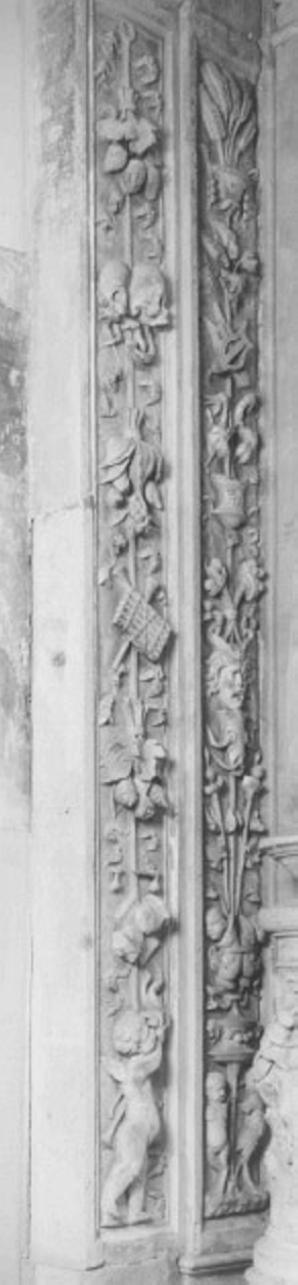 Lesene decorate con candelabre ornate con lunghi steli fioriti a rilievo nastri, teschi, frutti, strumenti musicali, bucrani, clessidre. Le due lesene piesterne recano nella parte inferiore un angioletto: quello di sinistra porta tra le mani una fiammella, quello di destra suona un flauto