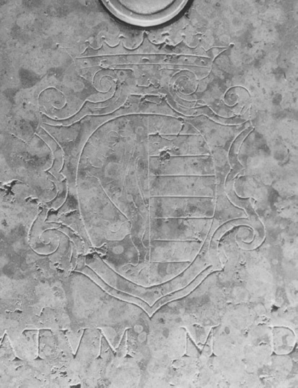 - STEMMI In basso al centro - gentilizio - Stemma - Coronato, a destra leone rampante, a sinistra fasciato di otto pezzi
