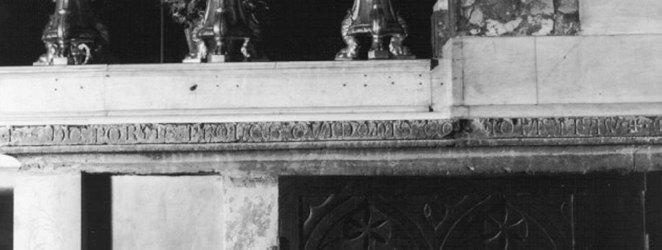 - ISCRIZIONI Spessore posteriore della mensa - DE PORTIS PROLES GUIDONIS CONDIDIT ARAM / MILLO DUCENTESIMO / OCTAVO / NONO. SODE SECUNDA INDIC- TIONE / .+. / HANC . OB . VITANDAM PESTEM TORTORIS AMARAM - caratteri gotici - a solchi -