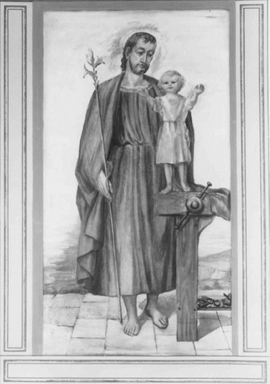 Personaggi: San Giuseppe; Cristo Bambino. Attributi: (San Giuseppe) bastone fiorito; tavolo da lavoro. Paesaggi: mare; montagne