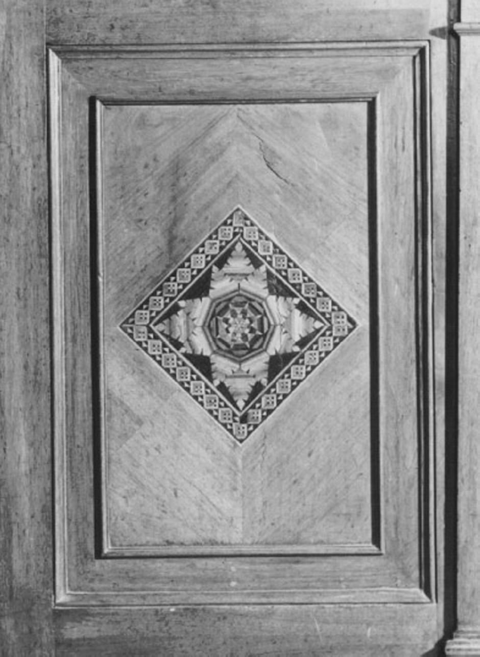 - NOTIZIE STORICO CRITICHE Nel 1824 viene demolito il coro - ideato da Lorenzo da Bologna - della chiesa primitiva per far luogo al campanile va perso il coro ligneo quattrocentesco i cui 24 schienali erano dovuti a P. A. Abbati non solo: vengono rovinati anche gli armadi della sacrestia. Commissionati nel 1504 ai falegnami Luca e Leonzio. Si recuperano pero' 6 tarsie dell'ab- bati piu' svariati pezzi degli armadi cinquecenteschi e sono questi che gia' il Berti nel 1833 vede riutilizzati nell'arredo. Seconso M. Caffi (1878) pero', delle tarsie pittoriche soli due sarebbero gia' inglobate in un armadio, mentre le altre due (il Caffi ne vede solo quattro), si troverebbero sopra dei banchi
