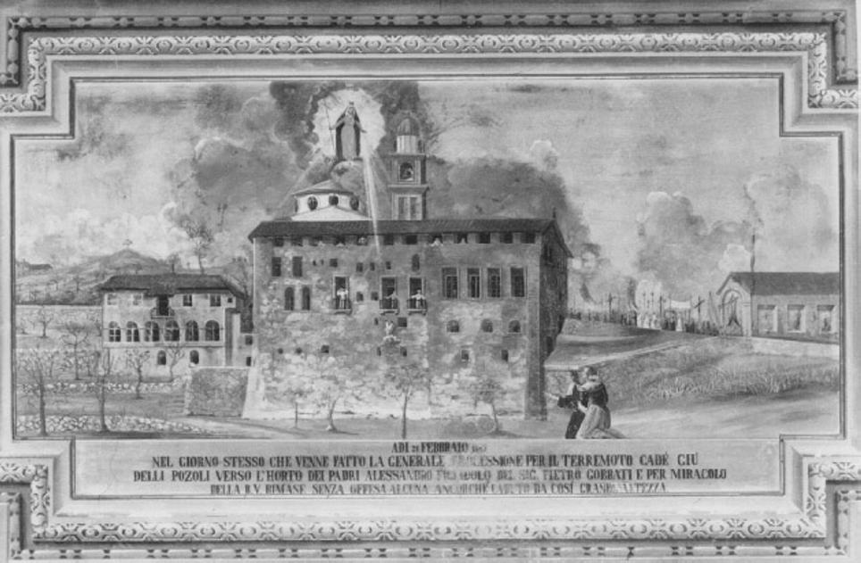 - ISCRIZIONI Sulla parte inferiore - ADI 26 FEB/ NEL GIORNO STESSO CHE VENNE FATTO LA GENERALE [...]SSIONE PER IL TERREMOTO CADE GIU'/ DELLI POZOLI VERSO L'HORTO DEI PADRI ALESSANDRO FIGLIUOLO DEL SIG.PIETRO GOEBATI E PER MIRACOLO/ DELLA B.V.RIMASE SENZA OFFESA ALCUNA ANCORCHE' CADUTO DA COSI' GRANDE ALTEZZA - lettere capitali - a pennello - italiano volgare