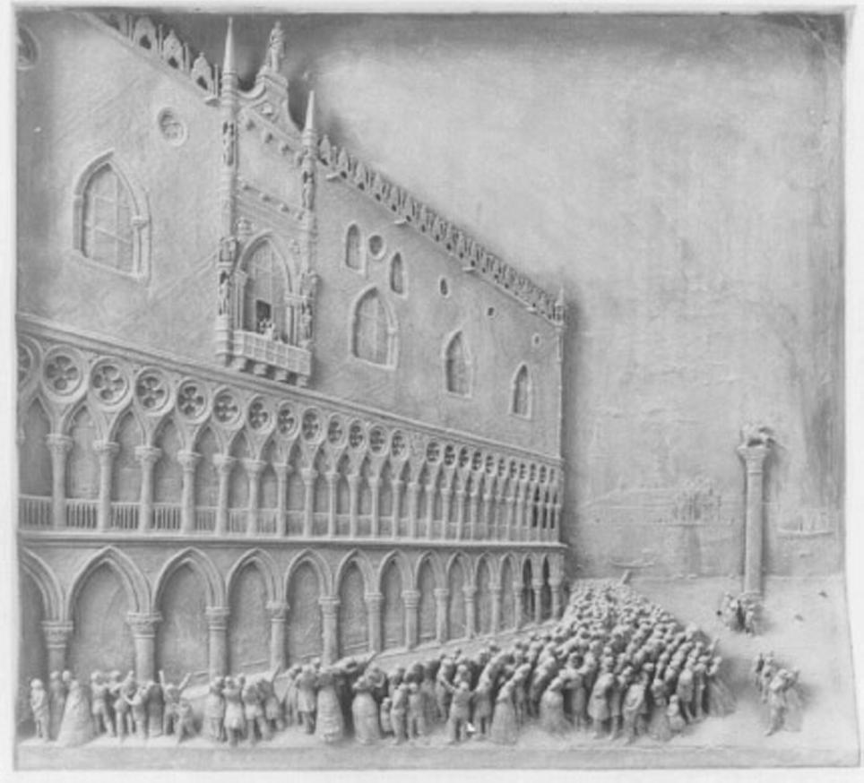 - NOTIZIE STORICO CRITICHE Il bassorilievo bronzeo, eseguito presumibilmente nel 1888, non cor- risponde a quello previsto nel progetto del 1886 di Carlo Morseletto