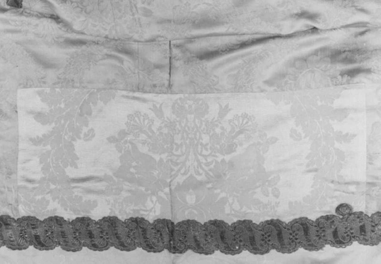 Tessuto: monocromo bianco, fondo raso faccia- catena, disegno in gros de Tours