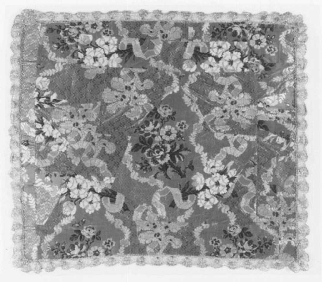 Tessuto: fondo rosa con motivi ottenuti per trame liseré e trame broccate in sete policrome e seta ondata. Fodera: taffetas rosa Gallone: trina a fuselli in oro filato e lamellare