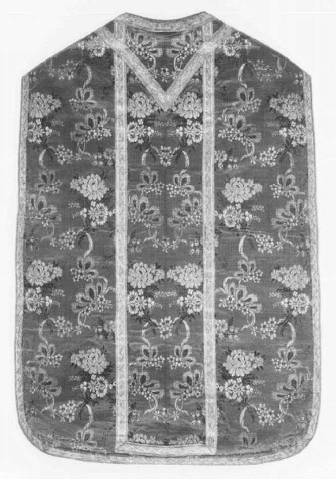 Tessuto: fondo viola con motivi ottenuti per trame lanciate e broccate in sete policrome. Gallone: a telaio in argento filato e lamellare Fodera: taffetas giallo oro