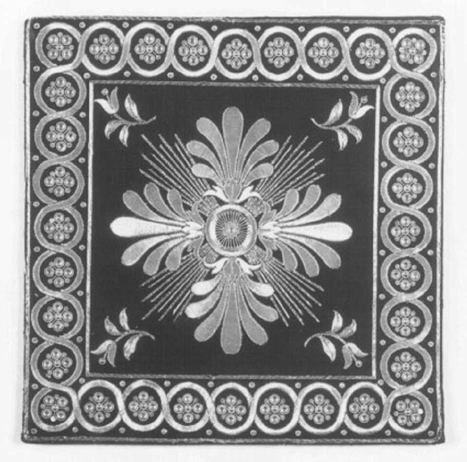 Tessuto: fondo rosso ricamato in argento filato e riccio, paillettes. Fodera: taffetas di seta avorio. Galloni: a fuselli in argento filato e lamellare