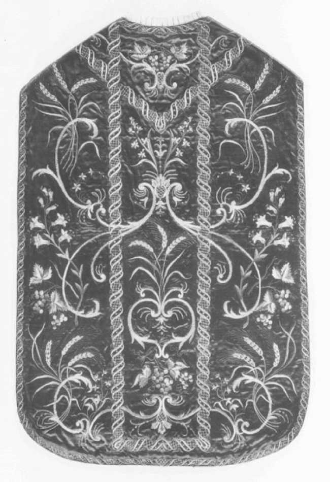 Tessuto: fondo rosso ricamato in sete policrome e argento filato riccio lamellare e paillettes. Galloni: a ricamo. Fodera: raso avorio liseré