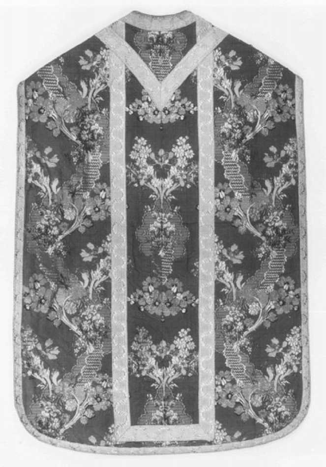 Tessuto: fondo violetto con effetti di controfondo in cannellato semplice variante, motivi ottenuti per trame broccate in sete policrome, seta ondata avorio, argento filato riccio e lamellare. Gallone: a telaio in argento filato e seta (?) bianca