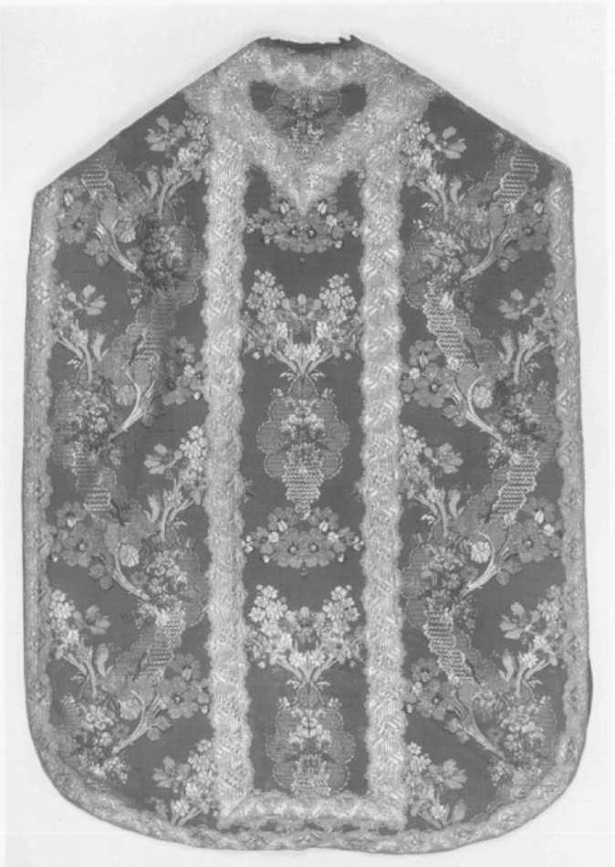 Tessuto: fondo violetto con effetti di controfondo in cannellato semplice variante, motivi ottenuti per trame broccate in sete policrome, seta ondata avorio, argento filato riccio e lamellare. Gallone: a telaio in argento filato e lamellare e seta bianca