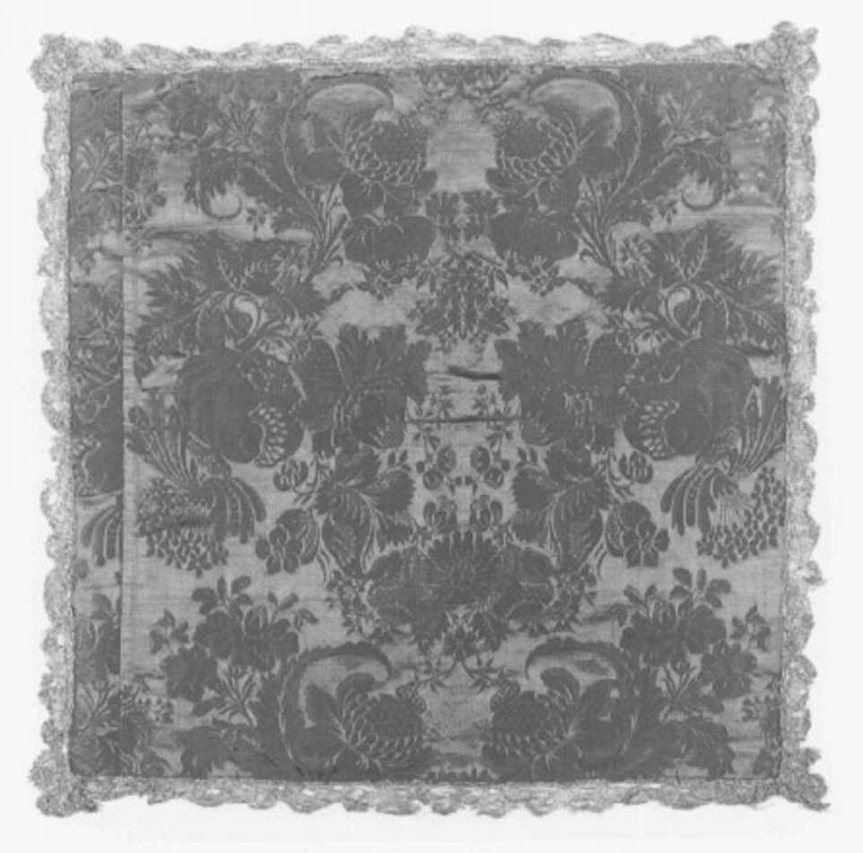 Tessuto: monocromo viola ad effetto damascato. Fodera: taffetas giallo oro. Gallone: trina a fuselli in argento filato e lamellare