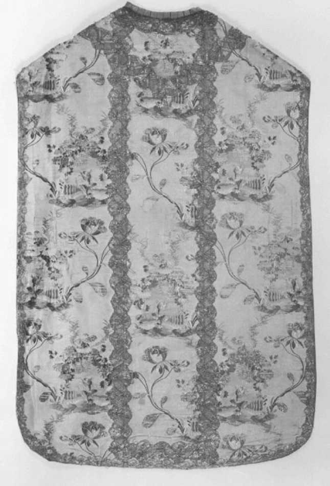 Tessuto: fondo avorio, motivi ottenuti per trame broccate in oro lamellare e filato, argento lamellare e sete policrome