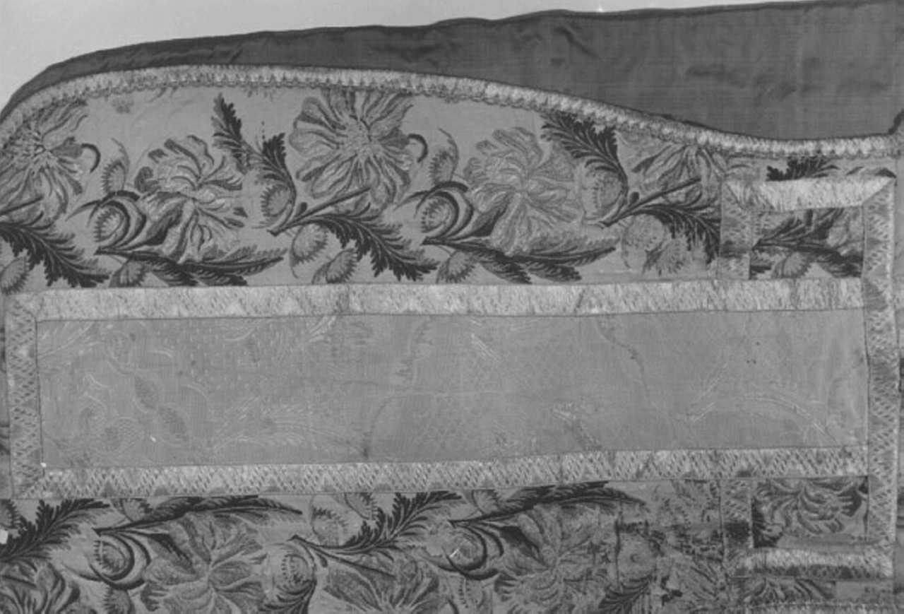 Tessuto: fondo rosa, motivi ottenuti per slegature della trama (effetto liseré) e dell' ordito (effetto cannellato) in seta avorio; motivi ottenuti per trame broccate in argento filato riccio e lamellare