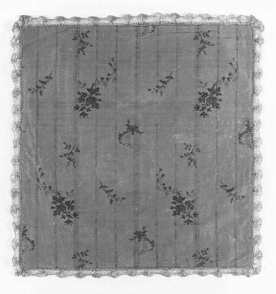 Tessuto: fondo in taffetas verde e cannellato semplice; motivi ottenuti per trame broccate in sete policrome e seta ondata verde. Fodera: tela rosa chiaro
