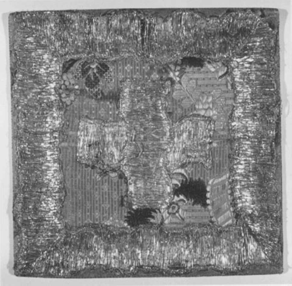 Tessuto: fondo verde chiaro con effetti di controfondo per trame liseré, motivi ottenuti per trame broccate in sete policrome e seta ondata avorio, e per effetto dell'armatura di fondo in taffetas verde chiaro. Gallone: a fuselli in argento lamellare e filato. Fodera: taffetas di giallo ocra