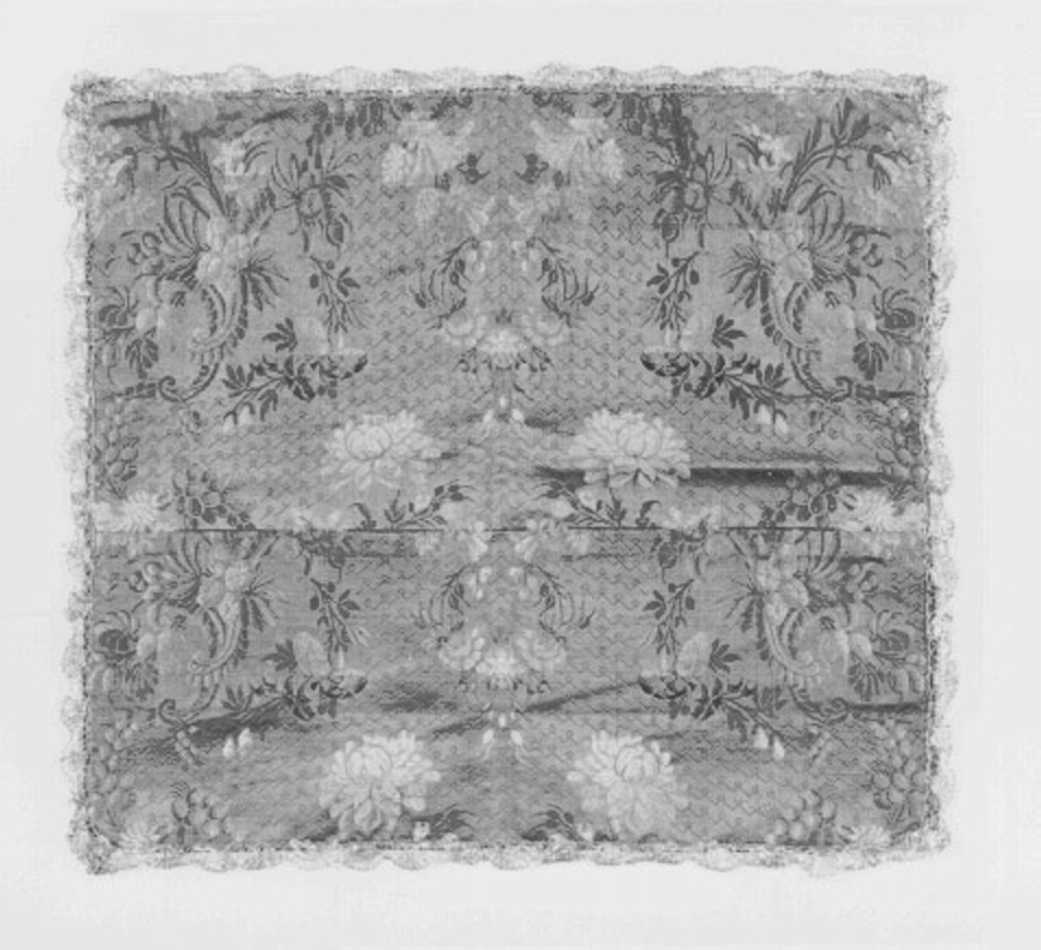 Velo di calice tessuto fondo raso marrone, di controfondo per trame liserees verde, motivi ottenuti per trame lanciate in sete policrome. Fodera in raso rosa. Gallone a fuselli in argento filato e lamellare. Decorazione: motivo a teorie orizzontali con andamento alterno di fiori e tralci fioriti