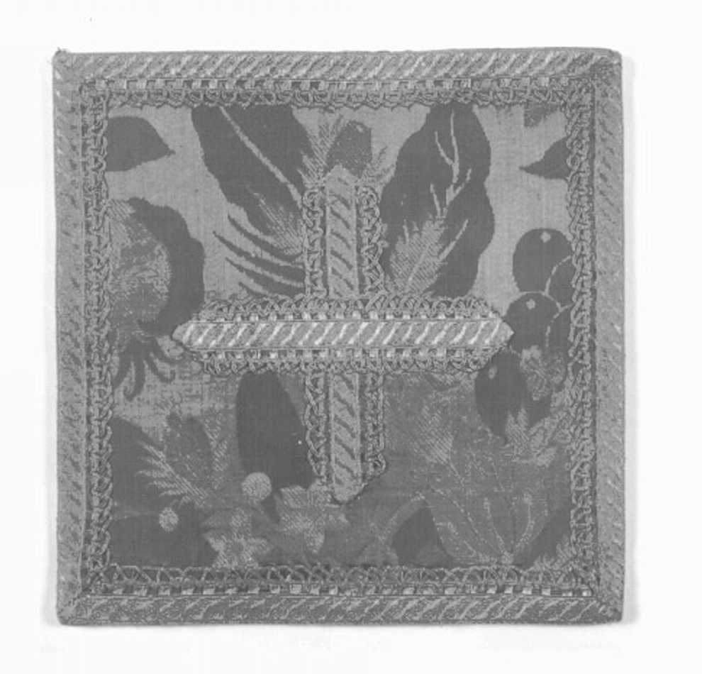 Borsa tessuto fondo raso verde faccia catena, disegno gros de Tours, motivi ottenuti per trame broccate in sete policrome oro filato e argento filato. Fodera in raso rosa. Gallone a telaio in oro filato e riccio e seta gialla. Decorazione: motivo a teorie orizzontali con melograne e tralci fioriti