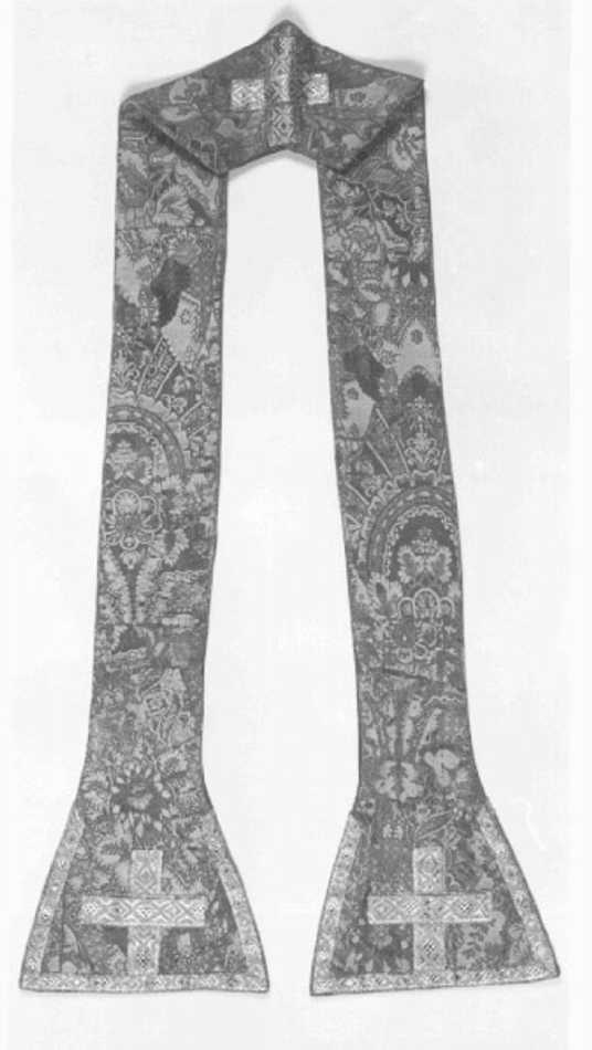 Stola tessuto fondo gros de Tours avorio, motivi ottenuti per trame lanciate in seta gialla e seta verde e trame broccate in sete policrome. Fodera in tela di cotone verde. Gallone a fuselli in argento filato e lamellare. Decorazione: motivo a pizzo