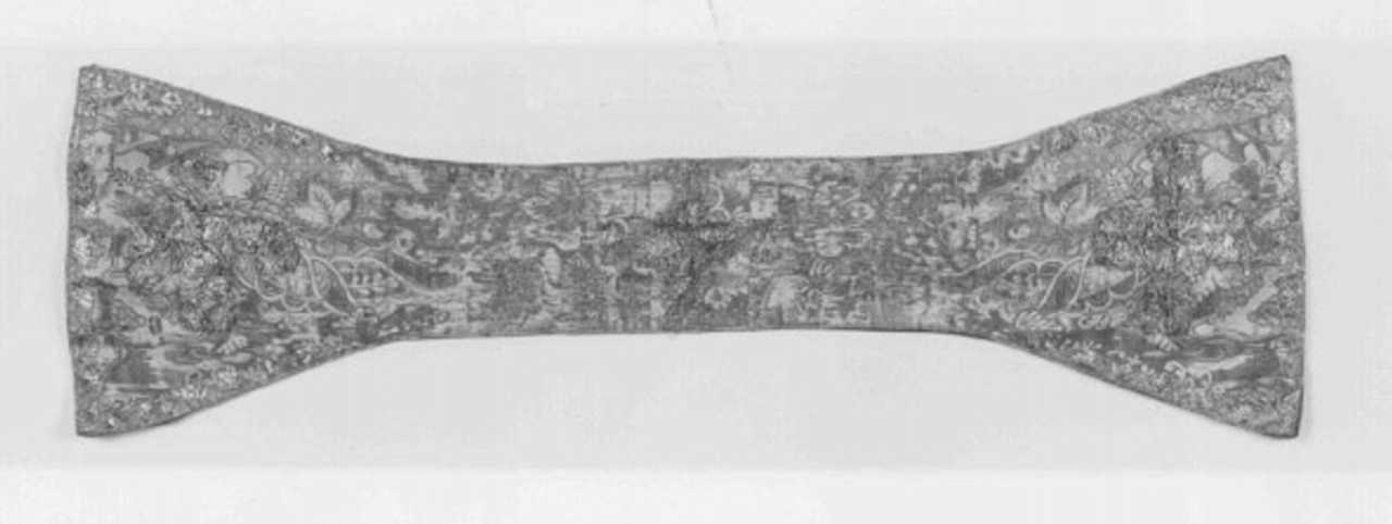 Manipolo tessuto fondo gros de Tours avorio, motivi ottenuti per trame lanciate in seta gialla e seta verde e trame broccate in sete policrome. Fodera in tela di cotone verde. Gallone a fuselli in argento filato e lamellare. Decorazione: motivo a pizzo