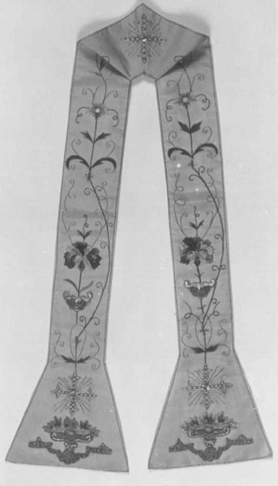 Stola tessuto fondo avorio ricamato in sete policrome, oro filato riccio e lamellare, argento filato e riccio. Gallone a ricamo
