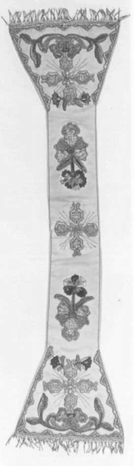 Manipolo tessuto fondo avorio ricamato in sete policrome, oro filato riccio e lamellare, argento filato e riccio. Gallone a ricamo