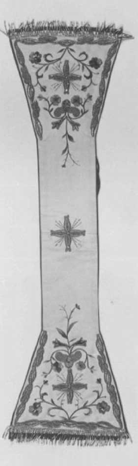 Manipolo tessuto fondo avorio ricamato in sete policrome, oro filato riccio e lamellare, argento filato e riccio. Gallone a ricamo. Fodera cotone rosso