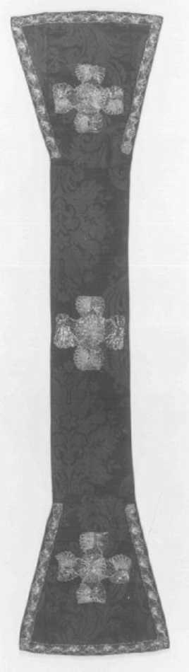 Manipolo tessuto monocromo viola con fondo raso faccia catena e motivi raso faccia trama. Gallone a fuselli in argento filato riccio e lamellare. Fodera in cotone viola. Motivi a maglie ovali a doppia punta