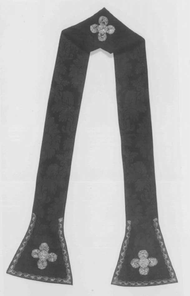 Stola tessuto monocromo nero con fondo raso faccia catena e motivi raso faccia trama. Gallone a fuselli in argento filato riccio e lamellare. Fodera in raso nero. Motivo a maglie ovali a doppia punta