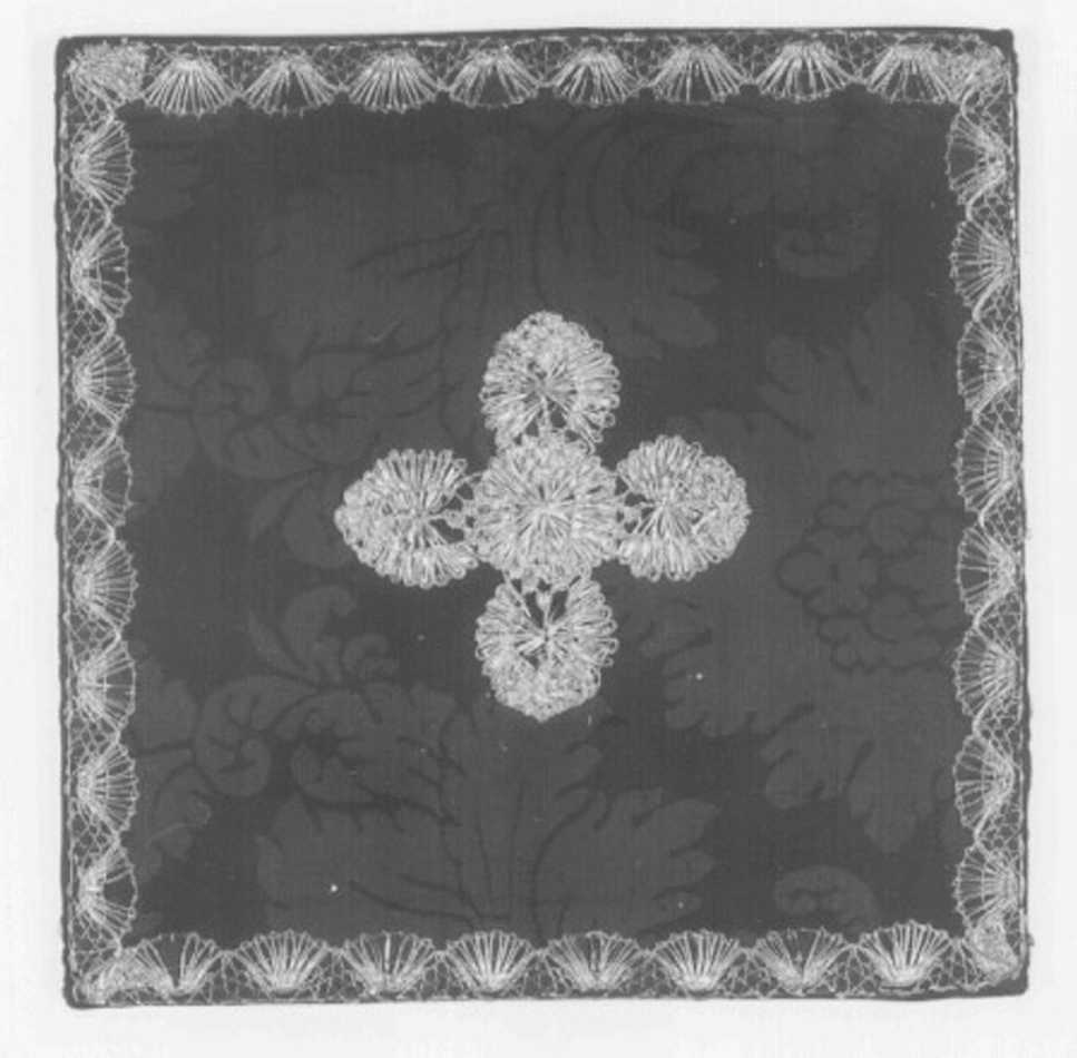 Borsa tessuto monocromo nero con fondo raso faccia catena e motivi raso faccia trama. Gallone a fuselli in argento filato riccio e lamellare. Fodera in raso nero. Motivo a maglie ovali a doppia punta