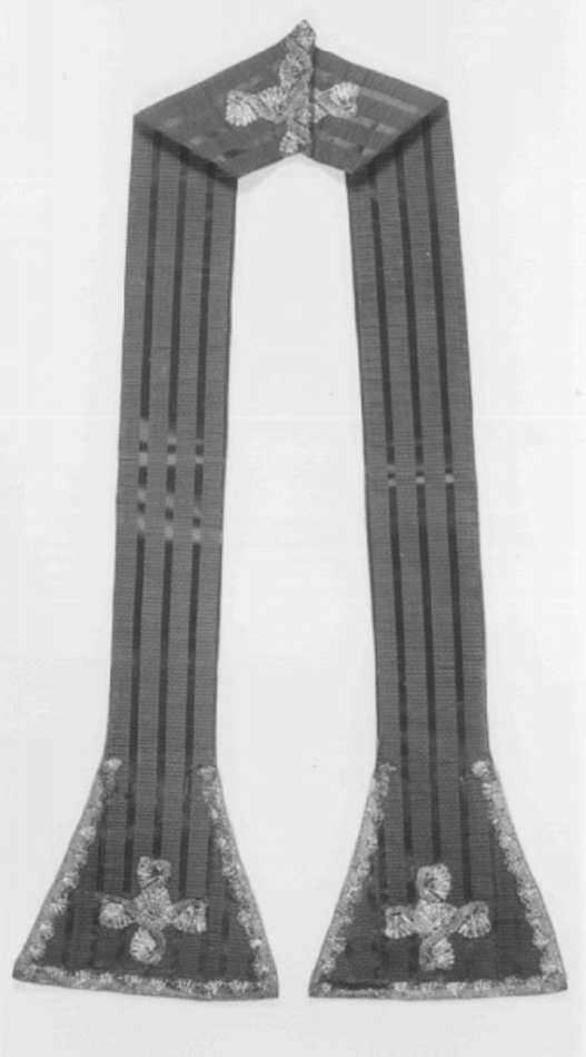 Stola tessuto fondo monocromo rosa antico, raso e cannellato semplice. Gallone a fuselli in argento filato e lamellare. Fodera taffetas giallo