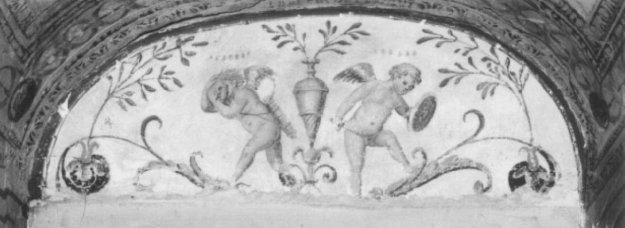 Scomparto a lunetta decorato a grottesca e con cornice dipinta a ovuli. Parzialmente lacunoso lungo il bordo inferiore, presenta dei girali da cui si dipartono dei rami di ulivo che crescono lungo i bordi laterali della lunetta. Al centro, è raffigurata un’anfora da cui fuoriescono altri due corti rami di ulivo. Ai lati di quest’ultima, vi sono due putti alati con un’iscrizione sopra ciascuna delle loro figure. Il putto di sinistra è di profilo e dà le spalle al centro della lunetta, ha una faretra a tracolla e tiene sul viso una maschera con le mani. L’altro, rivolto di tre quarti e in antitesi al precedente, ha uno scudo nella mano sinistra e una spada nella destra che sembra puntare verso un punto ai suoi piedi